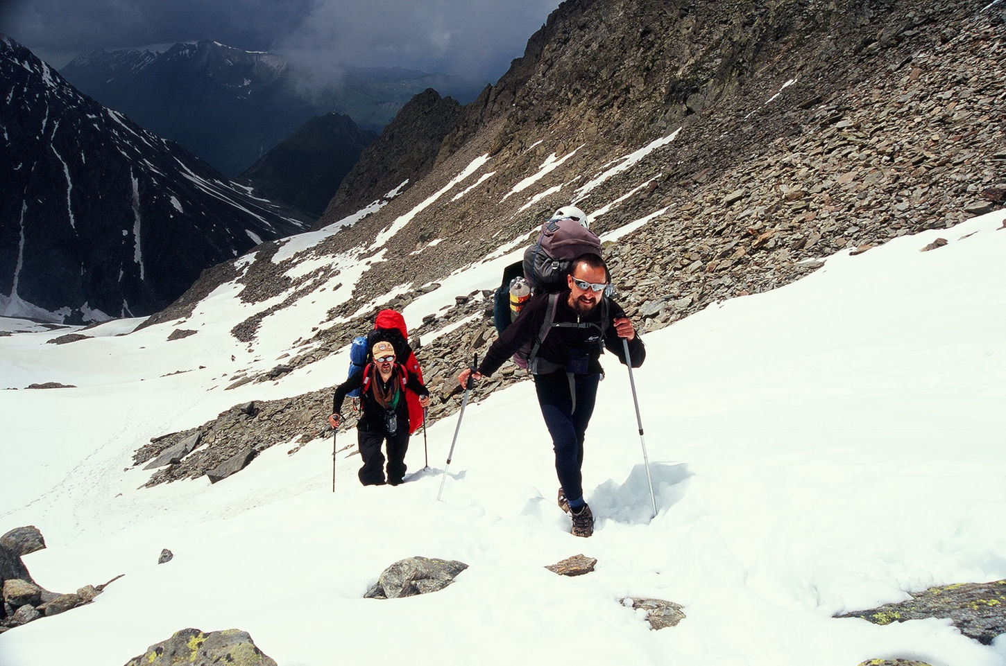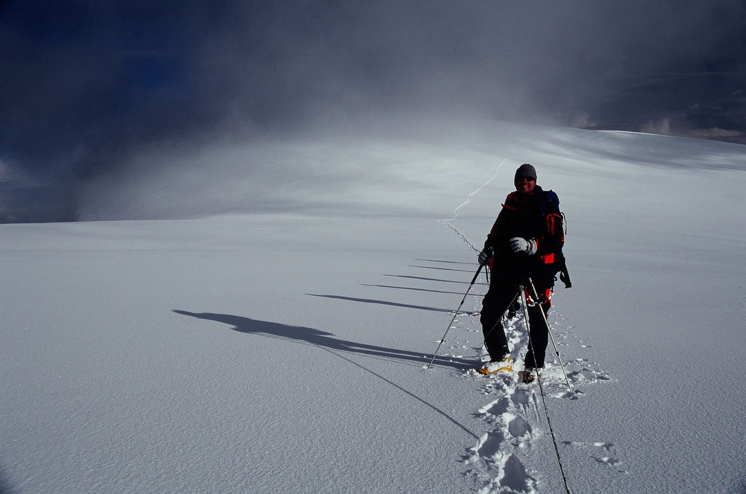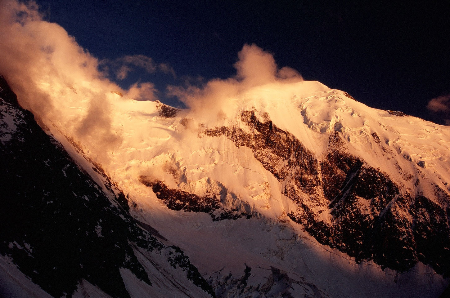 Wyjście zaplanowaliśmy na 3 w nocy. Zasadą wspinaczki wysokogórskiej jest rozpoczynanie ataków szczytowych na tyle wcześnie, by stanąć na wierzchołku przed południem. W górach wysokich po południu często zmienia się pogoda, rozbudowują się chmury i spada widoczność. Wtedy to trzeba być już po zejściu ze szczytu, w bezpiecznym miejscu biwakowym. W naszym przypadku pogoda w dniu ataku od początku nie była najlepsza. Podchodziliśmy w gęstej chmurze całą swoją orientację opierając na wydeptanej przez poprzedników ścieżce. Niestety z czasem i ona przestała być widoczna zasypana nawianym śniegiem.