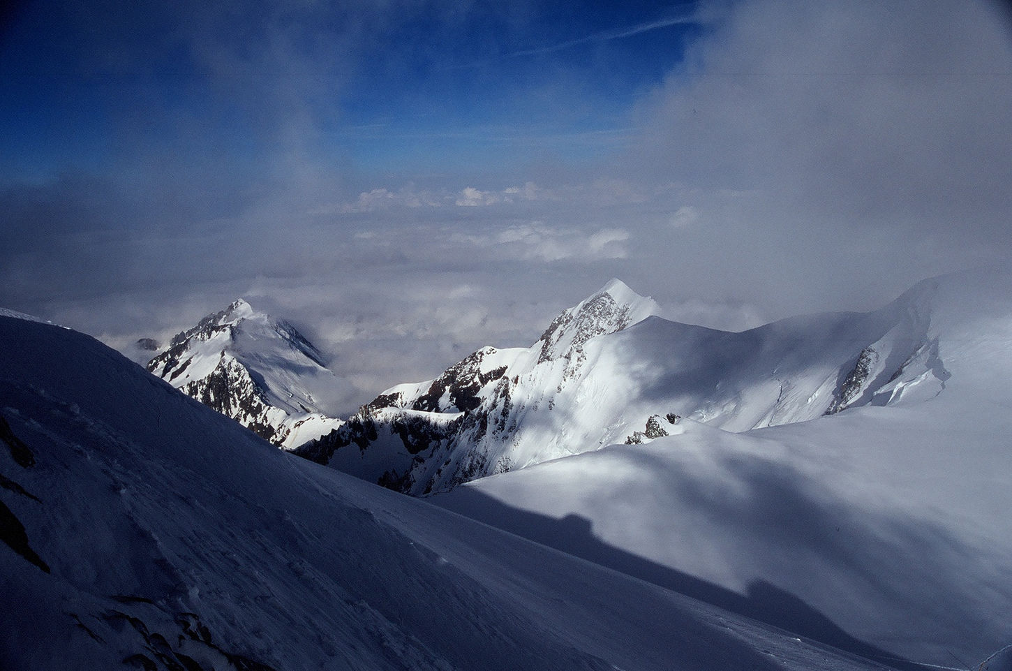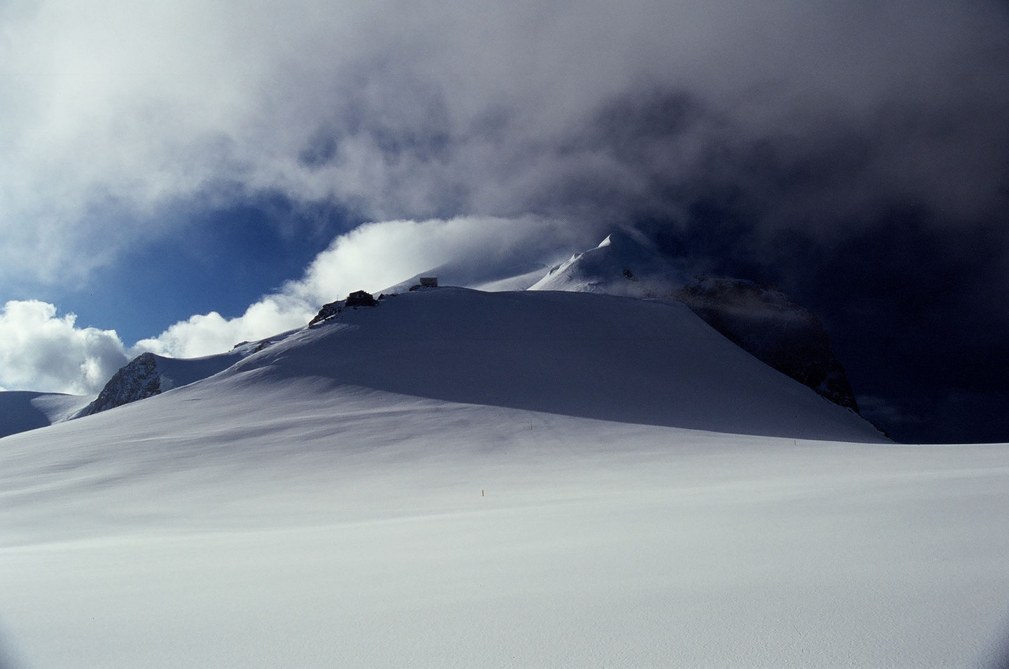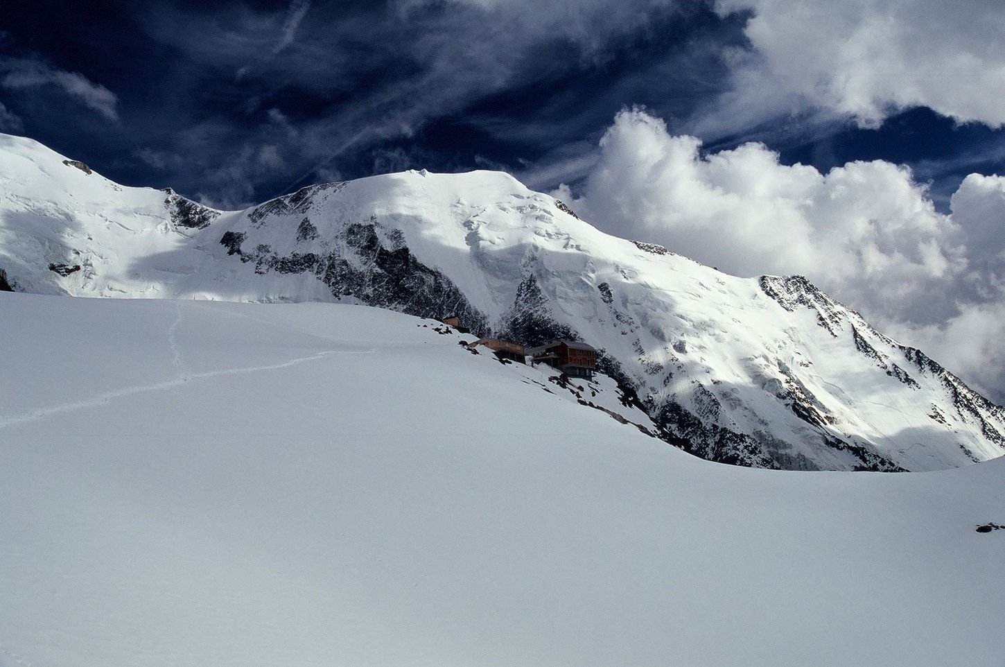 Tuż po świcie, na wysokości wierzchołka Dome du Gouter (4304 m n.p.m.), chmury na szczęście się rozwiały i oczom naszym ukazał się główny szczyt Białej Damy. Kiedy wydawało się, że nic już nie jest w stanie przeszkodzić nam w dotarciu na jej wierzchołek, zaczął wiać silny wiatr. Jedyną możliwą decyzją w takich warunkach był odwrót, zwłaszcza, że mocno rozbudowujące się chmury już na początku dnia nie wróżyły najlepiej. Musieliśmy uznać wyższość góry i po dojściu do schronu Vallot na wysokości 4347 metrów zawróciliśmy w kierunku schroniska Gouter i naszego noclegu.