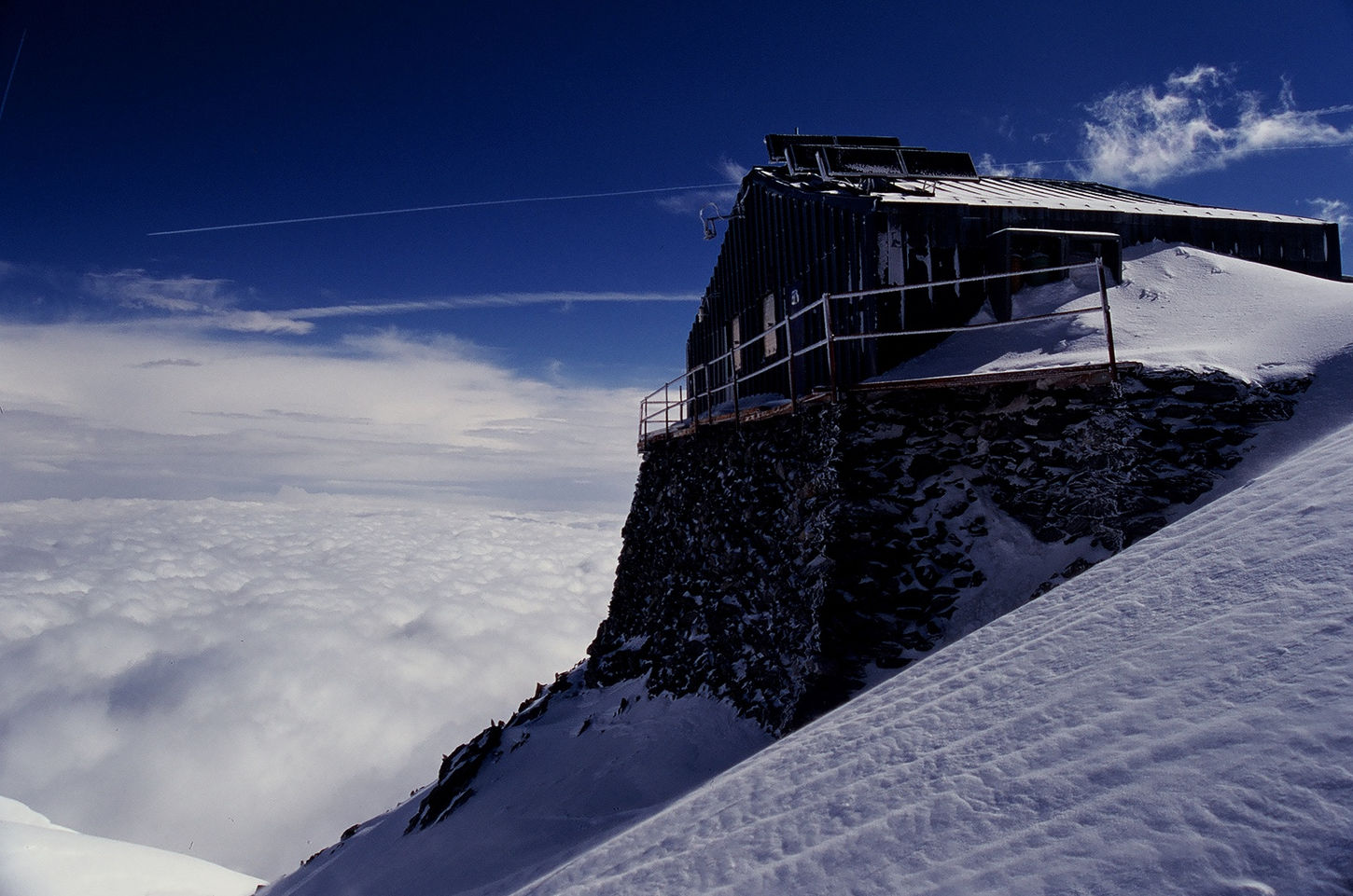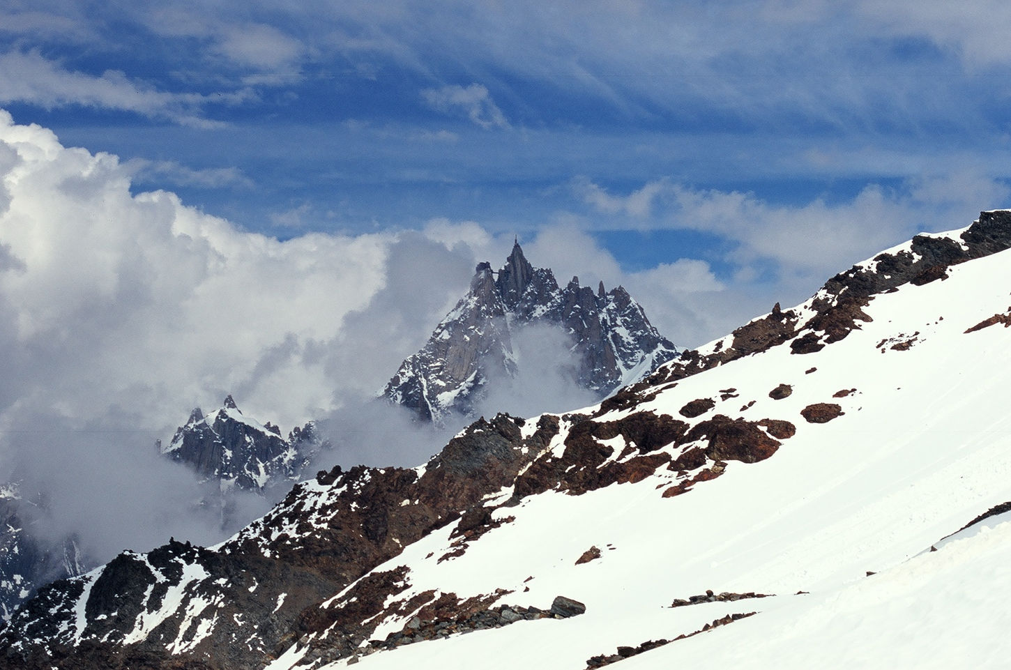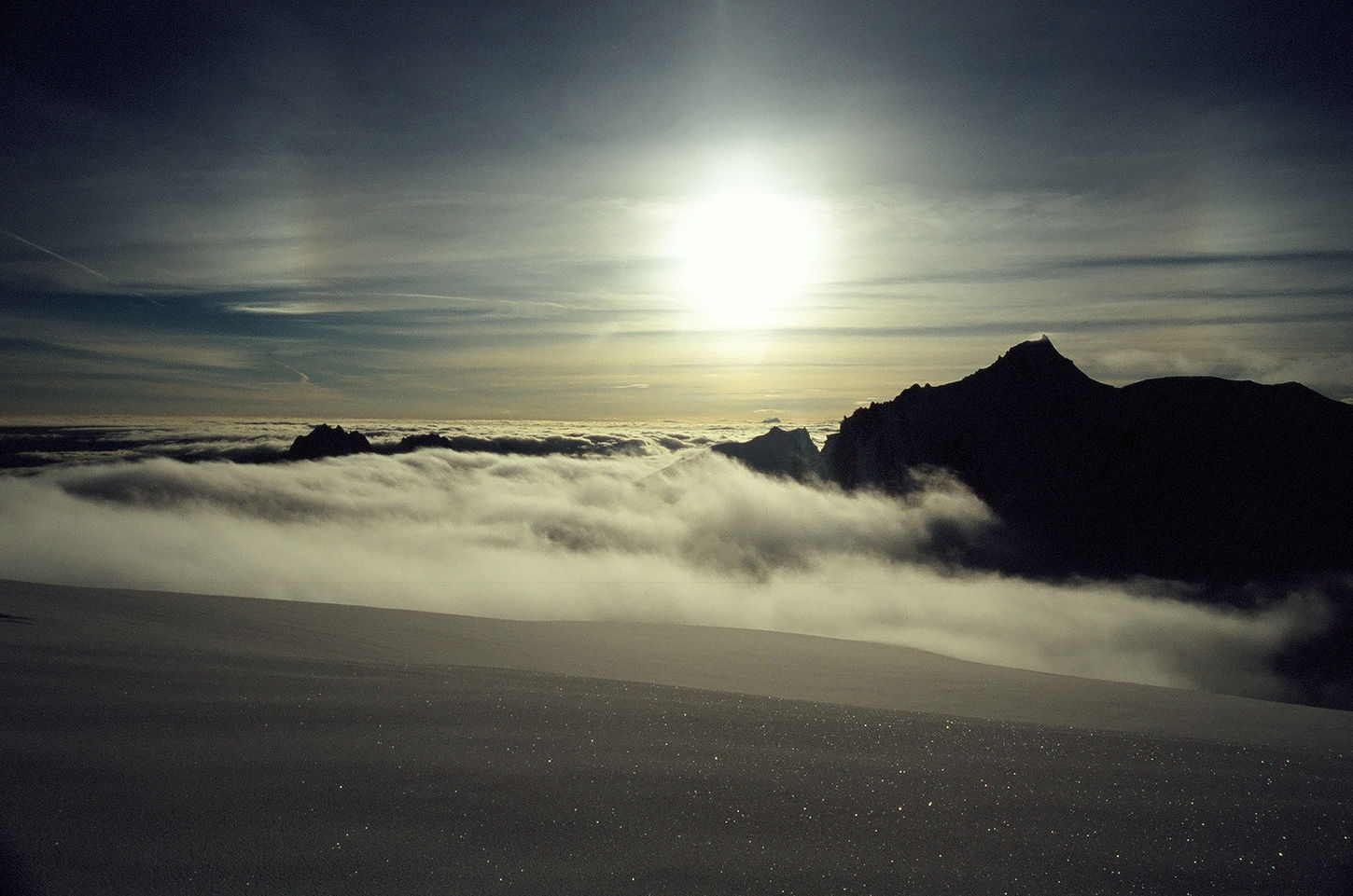 Tuż po świcie, na wysokości wierzchołka Dome du Gouter (4304 m n.p.m.), chmury na szczęście się rozwiały i oczom naszym ukazał się główny szczyt Białej Damy. Kiedy wydawało się, że nic już nie jest w stanie przeszkodzić nam w dotarciu na jej wierzchołek, zaczął wiać silny wiatr. Jedyną możliwą decyzją w takich warunkach był odwrót, zwłaszcza, że mocno rozbudowujące się chmury już na początku dnia nie wróżyły najlepiej. Musieliśmy uznać wyższość góry i po dojściu do schronu Vallot na wysokości 4347 metrów zawróciliśmy w kierunku schroniska Gouter i naszego noclegu.