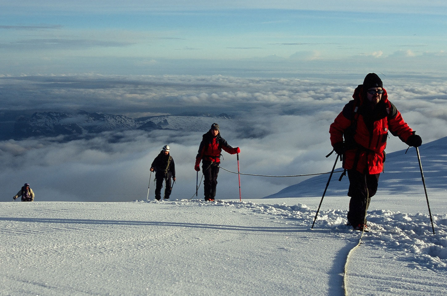 Na wierzchołku stanęło czworo uczestników wyprawy. Spędziliśmy tam prawie godzinę, fotografując oraz dzieląc się radością z pozostałymi wspinaczami i znajomymi z Polski poprzez telefon komórkowy. Po 3-godzinnym zejściu znaleźliśmy się ponownie w bezpiecznym i ciepły schronisku, mając w pamięci każdy krok podejścia na Białą Górę.